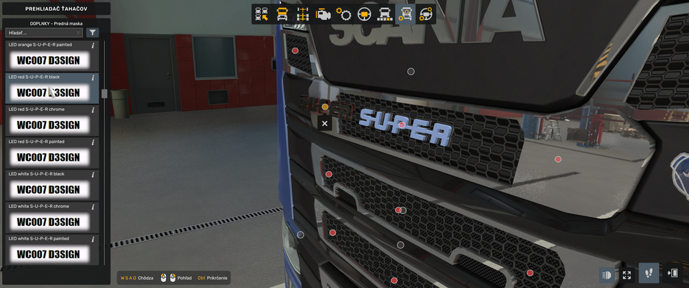 MOD description: LED S-U-P-E-R and LED SCANIA sign (black, chrome, painted) with white, orange or red lightning
