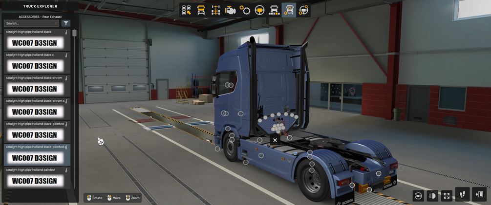 MOD description: Holland straight exhausts with trailer cables for all SCS Scania Nextgen trucks with new black exhausts